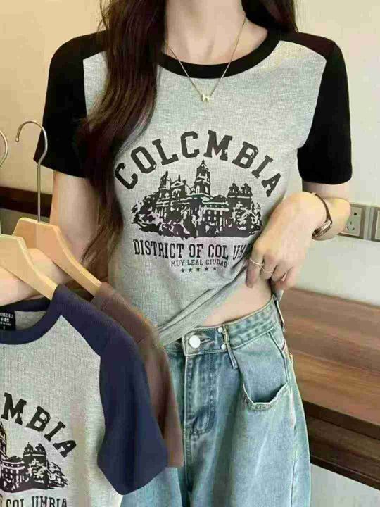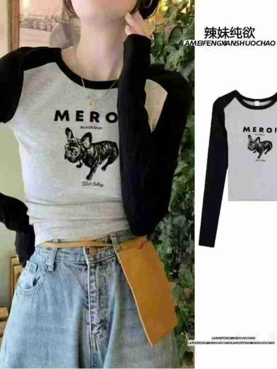 1230件夏季超好看辣妹撞色拼接字母长袖短袖t恤女春秋修身显瘦休闲百搭短款上衣!弹力