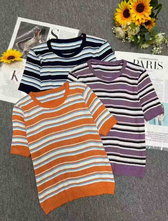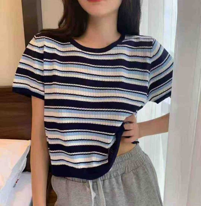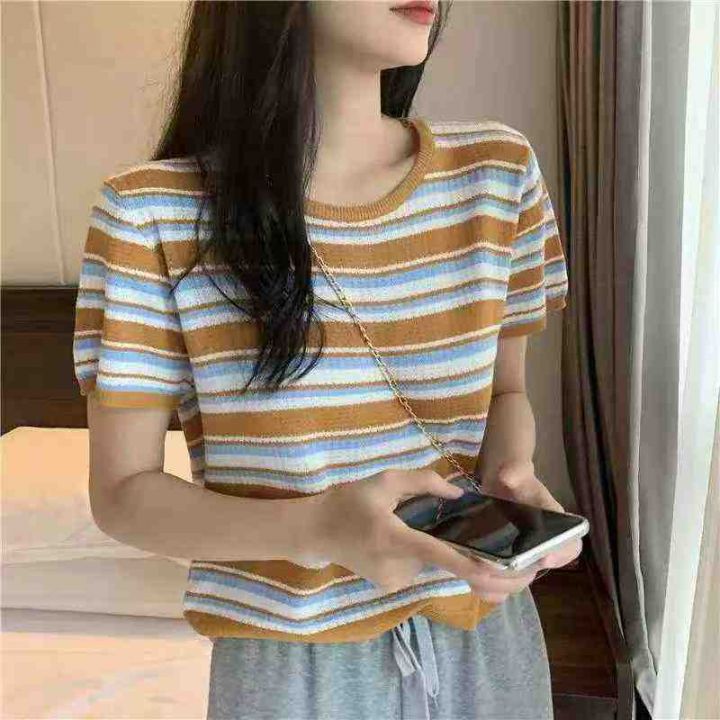 夏季新款韩版网红可甜可盐撞色条纹短袖针织衫,独立包...