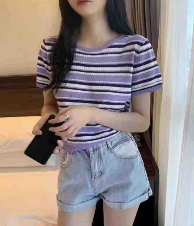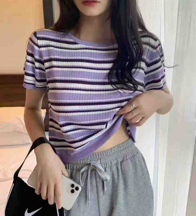 夏季新款韩版网红可甜可盐撞色条纹短袖针织衫,独立包装,均码面料柔软舒适弹力大,730件,全清6.9元超低价秒杀!分货加一!