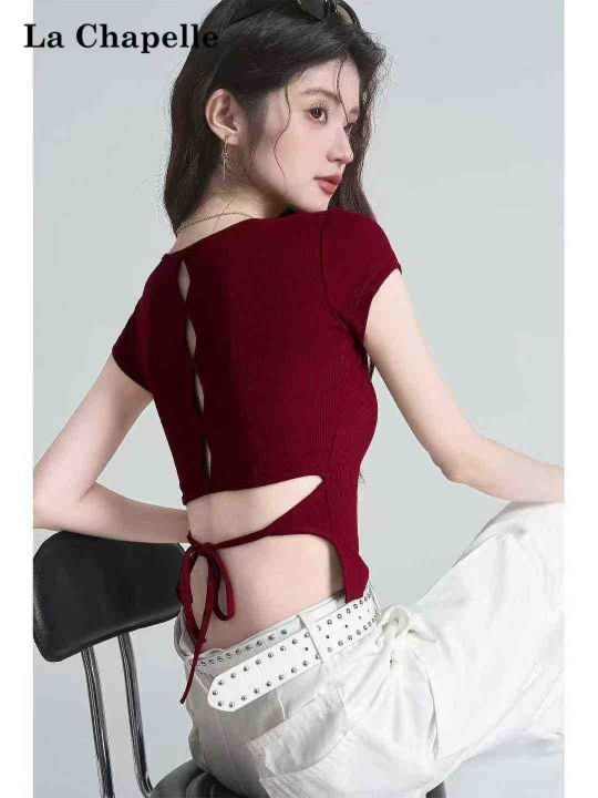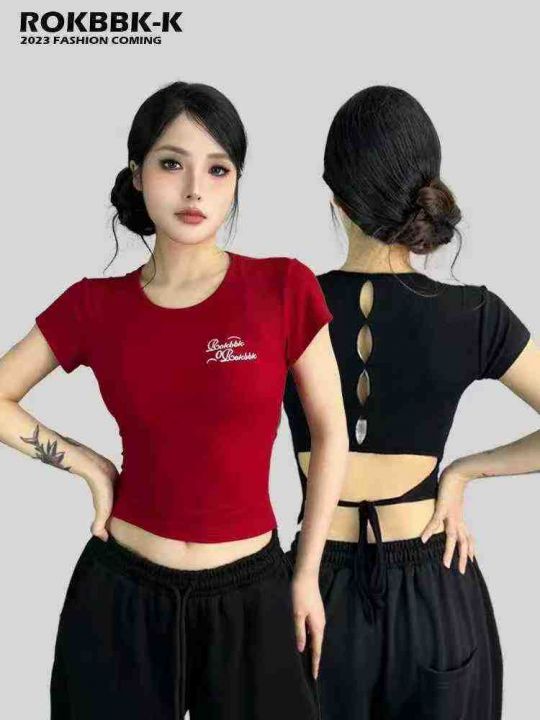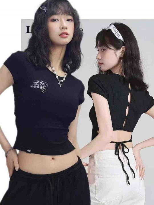 韩式刺绣后背镂空短袖T恤女夏季修身露背系带辣妹上衣潮,后背绑带镂空设计,重工刺绣图,独立包装,469件,s-XL,分货加1(货号0914#49)