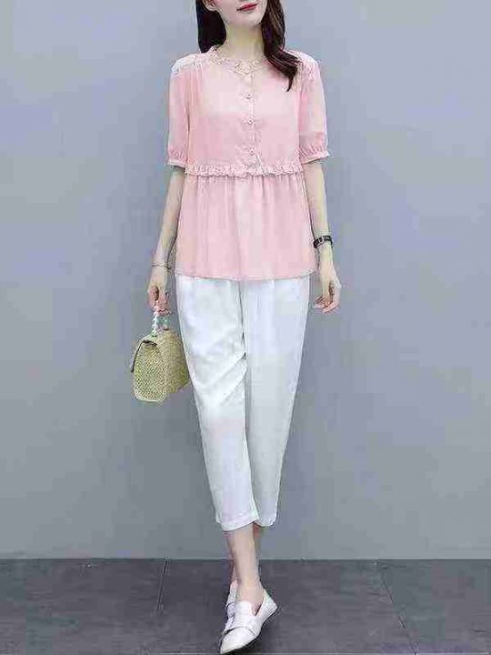 时尚减龄套装338套4.5,荷叶边拼接,纽扣设计,裤子松紧腰,有口袋,码数2...