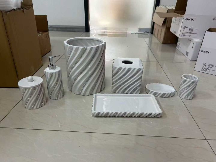 卫浴8件套 600套 垃圾桶 纸巾盒 托盘 乳液瓶 牙刷架 漱口杯 肥皂盘 棉花罐 各一个 陶瓷加亚克力钻的,谁要?