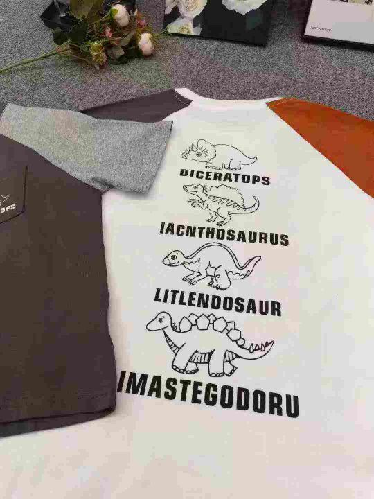 品牌高品质插肩拼色童装T恤短袖 数量1500件左右 尺码110--160 整款两个色 胸前口袋 后面印花 后领包边 独立包装带吊牌 货品整洁质佳