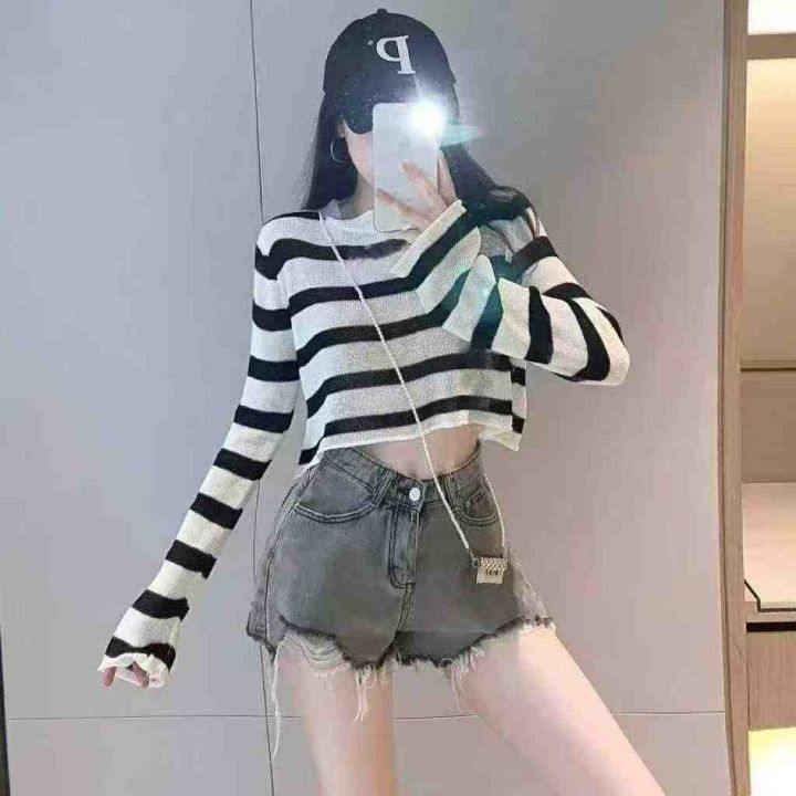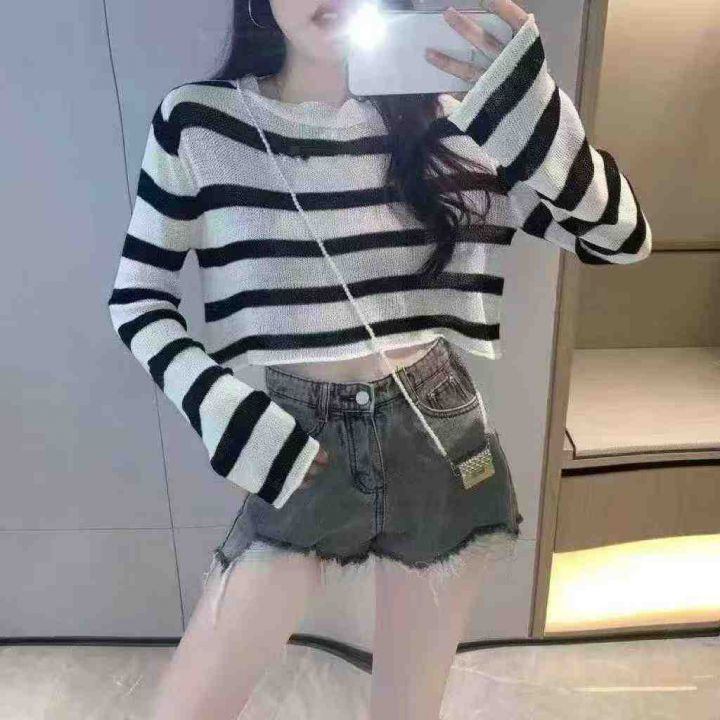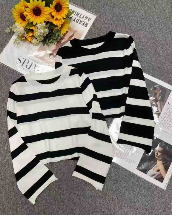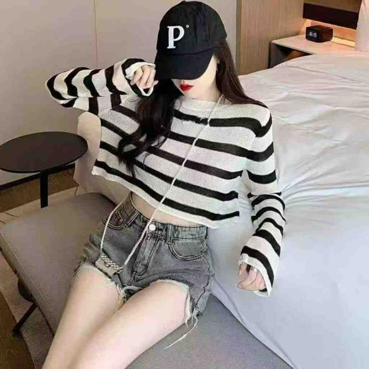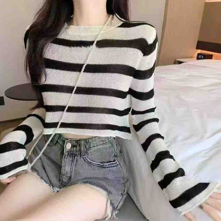 秋季新款撞色条纹靓妹针织长袖毛衣,独立包装,均码面...