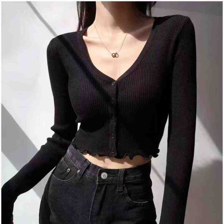 秋季新款复古辣妹高腰短款设计感小众木耳边v领针织毛...