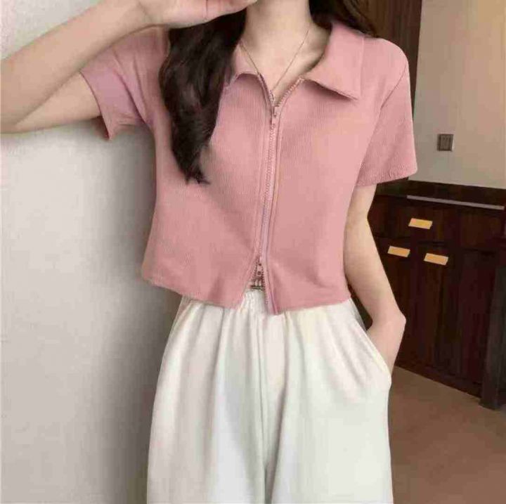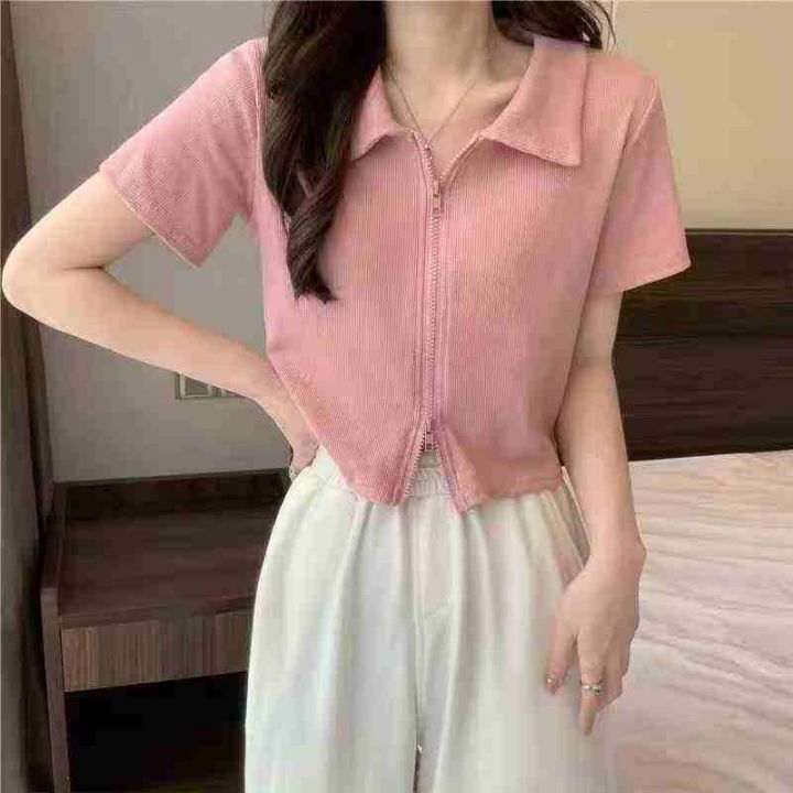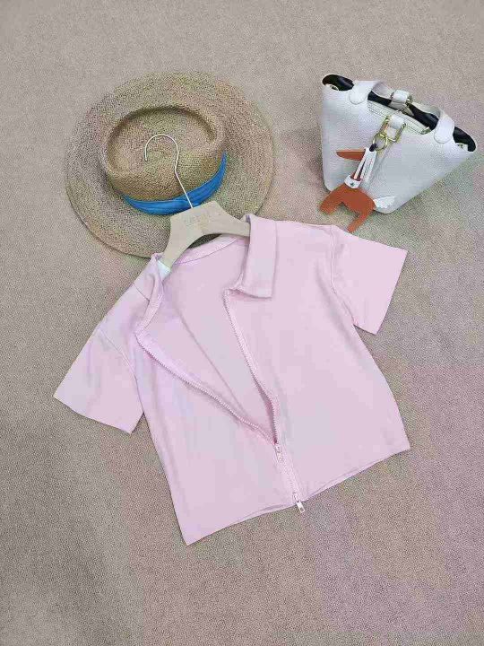 [月亮]:粉色Polo领双拉链短袖辣妹棉质上衣