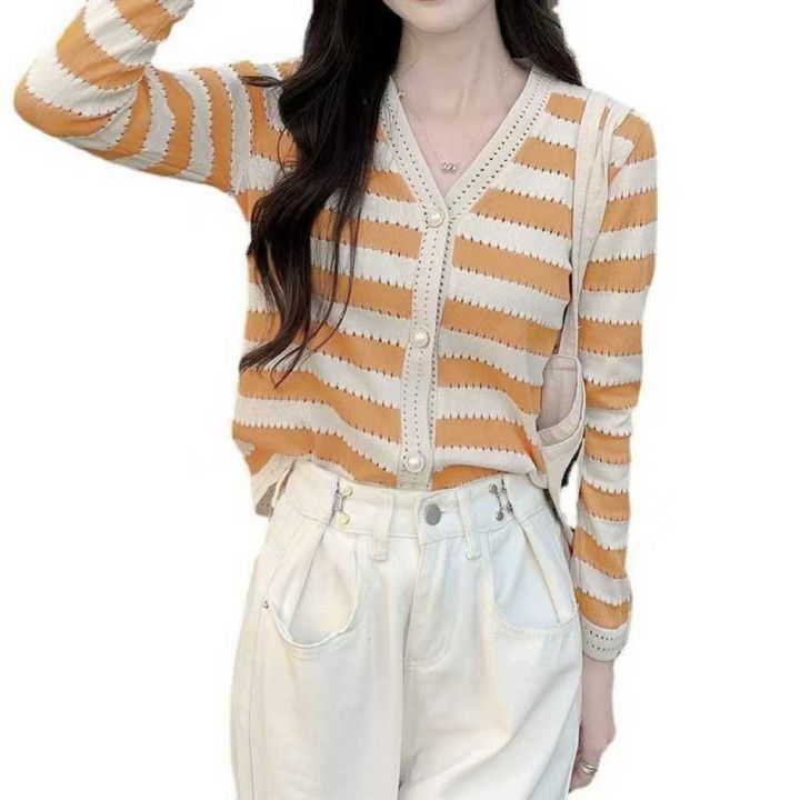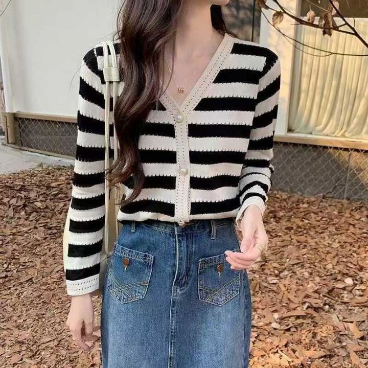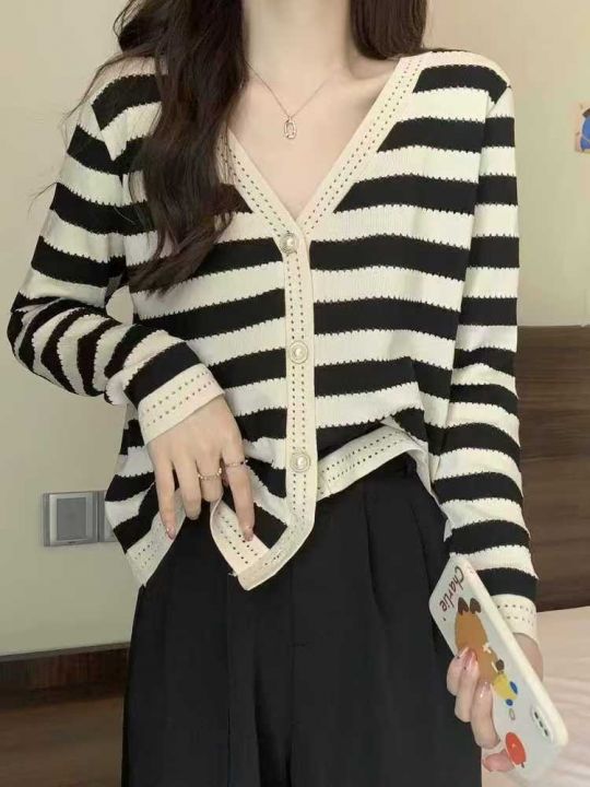 秋季新款复古条纹v领宽松小香风设计感遮肚显瘦长袖针...