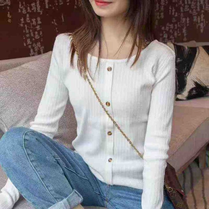 秋季新款洋气纯色百搭圆领气质纽扣设计款长袖针织套头...
