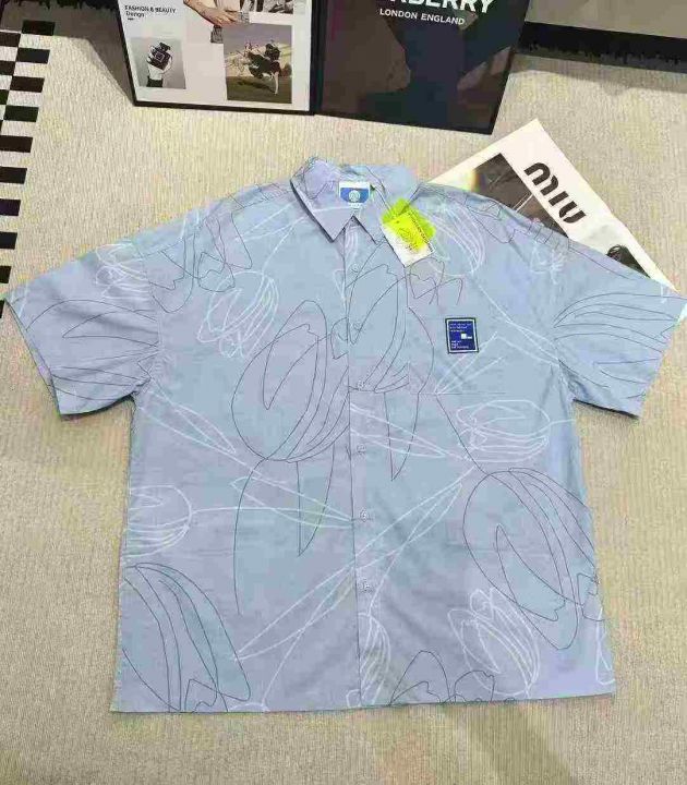 美式复古小众潮牌印花短袖衬衫男士时髦慵懒休闲度假...