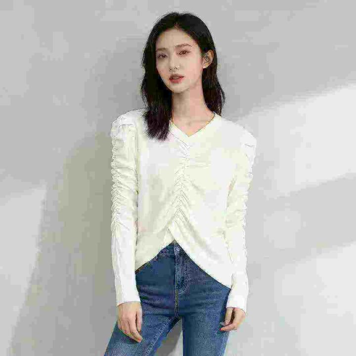 设计褶皱锁骨长袖辣妹修身新款收腰显瘦针织上衣,独立...