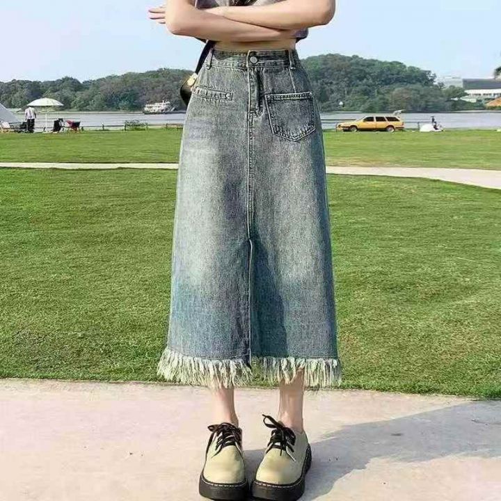 天猫精选390条,春秋季新款显瘦流苏设计感长款a字开衩洗水棉半身牛仔裙,单...