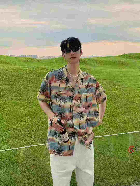 港风复古设计感海边印花椰树男士衬衣,[爱心]100件左右,码数S-M,穿80斤-140斤,独立包装️无瑕疵,模特图仅供参考