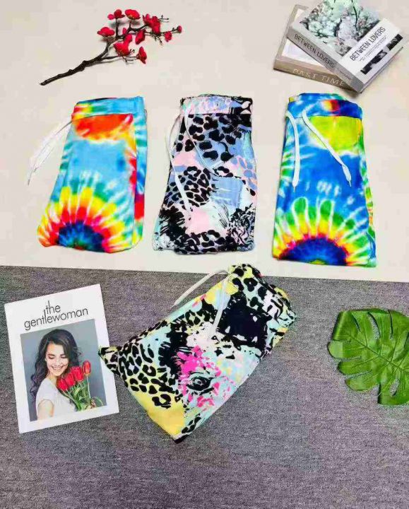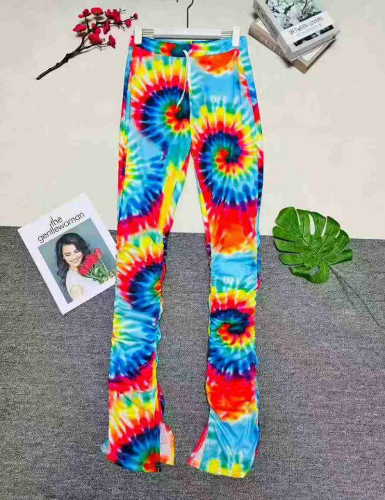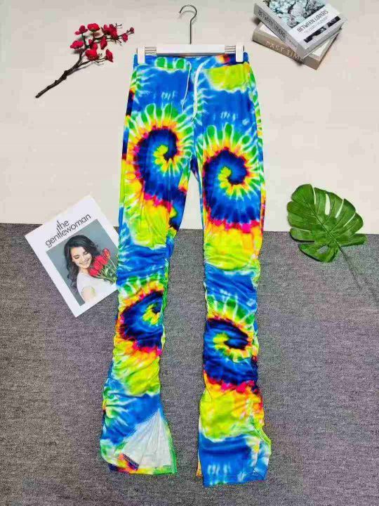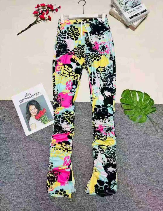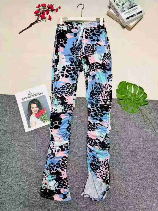欧美时尚外穿薄款松紧腰紧身彩色印花褶皱裤,裤脚开衩设计,数量300条左右,码数:S-2XL,品质好,有独立包装。