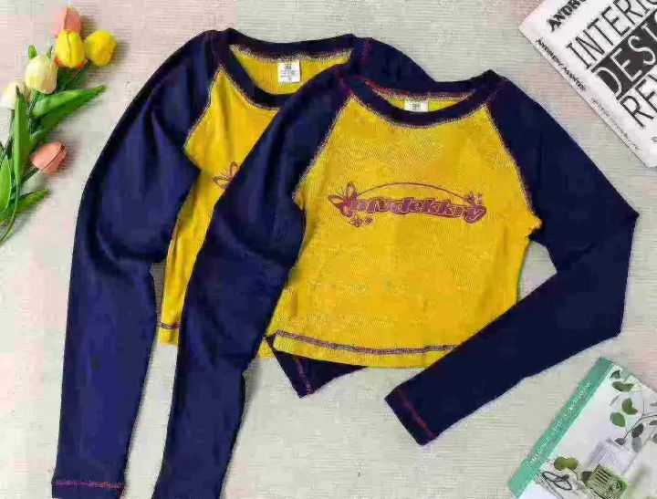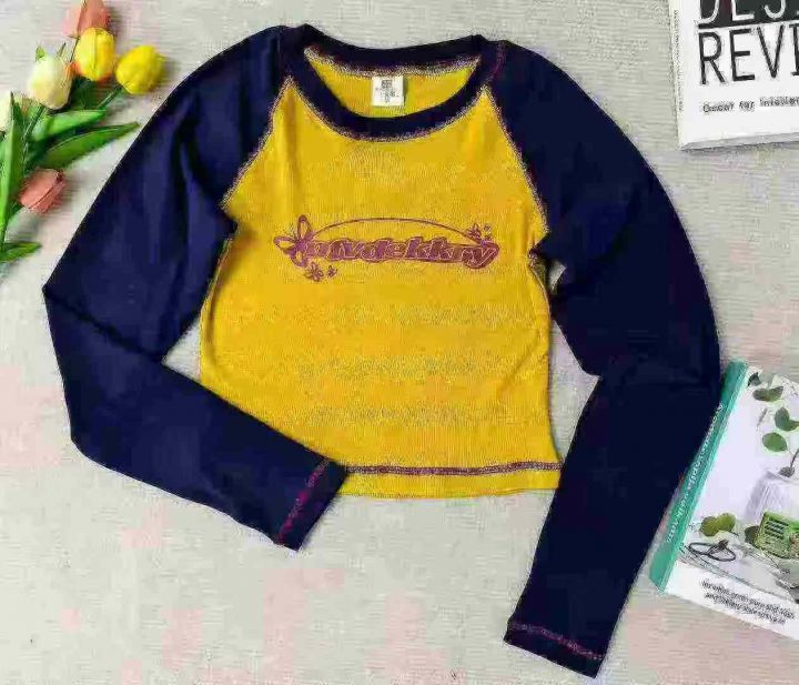 美式拼色复古辣妹春秋长袖T恤设计感小众修身短款靓妹插肩袖上衣,62件,1-3码,独立包装,罗纹棉面料,全清福利价5.8元