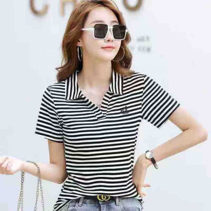 980件短袖T恤女2025夏季新款翻领上衣体恤弹力显瘦百搭条纹,天猫热卖新款,奥代尔罗纹面料带弹力,码数S一3XL,独立卡纸原包装带吊牌,重工刺绣工艺,全清10.8分货加1