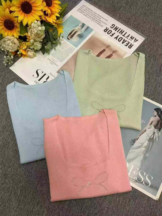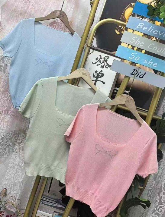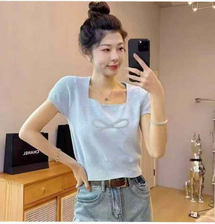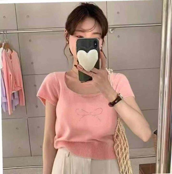 夏季新款温柔气质方领蝴蝶结烫钻印花宽松百搭短袖针织小衫粉色多,独立包装,均码面料柔软舒适,241件,全清6.9元超低价秒杀!分货加一!