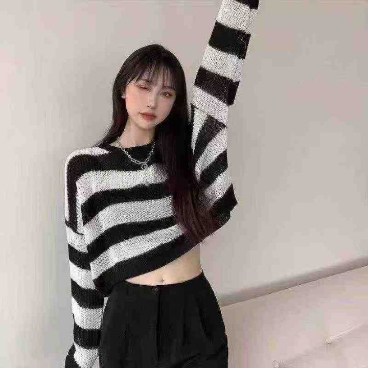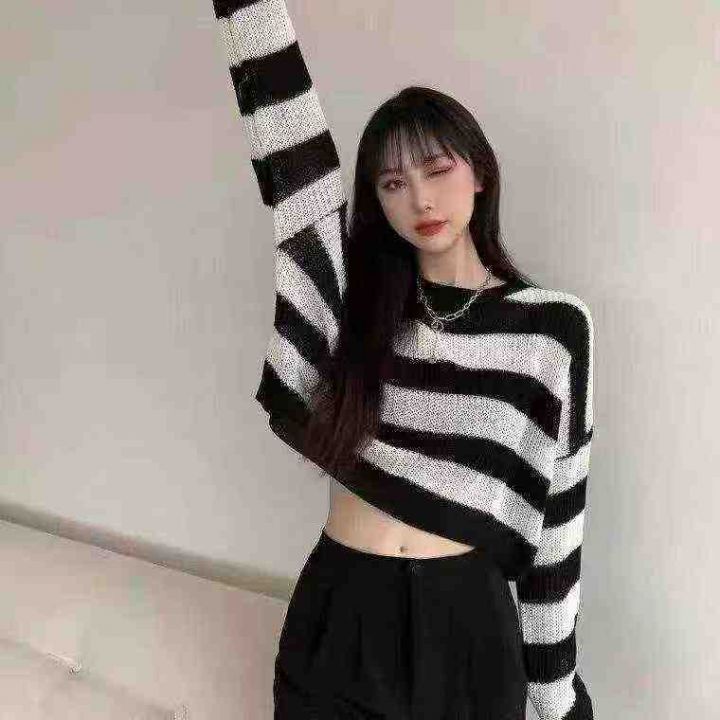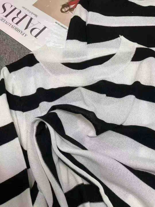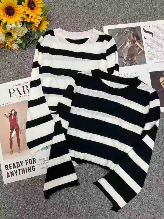 秋季新款撞色条纹靓妹针织长袖毛衣,独立包装,均码面...