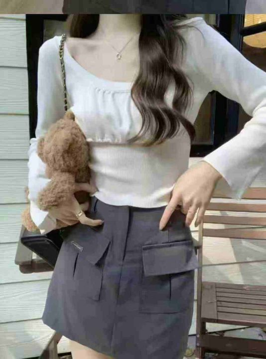 褶皱修身显瘦冰丝针织喇叭长袖T恤打底衫106件,独立包...