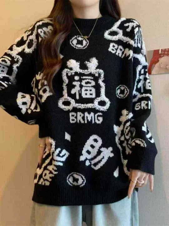 秋冬新款宽松慵懒风植绒提花工艺北极绒圆领套头毛衣,...