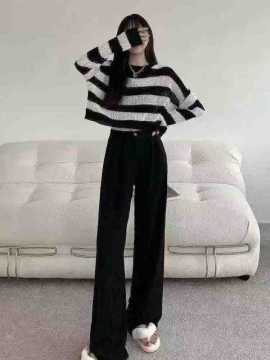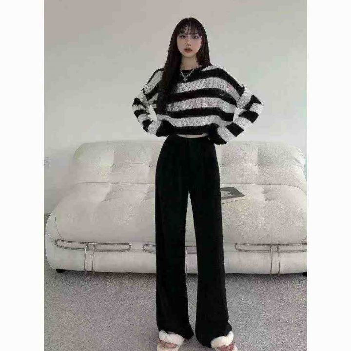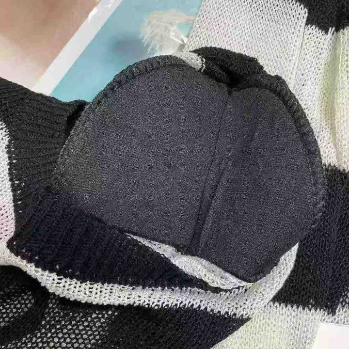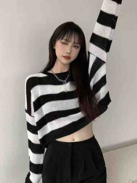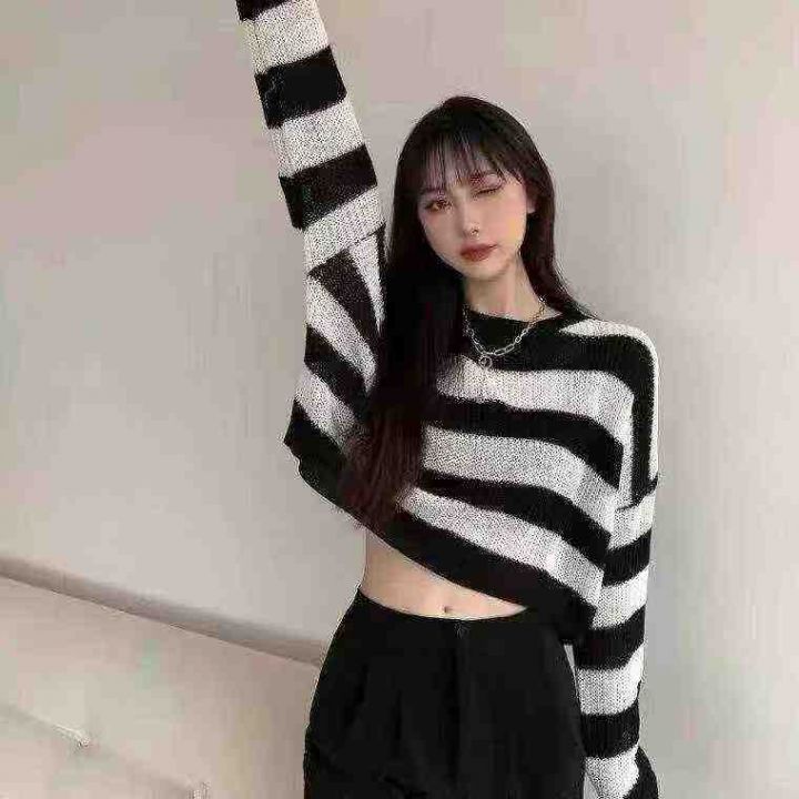 早秋新款靓妹短款宽松撞色黑白条纹针织长袖小衫,带配...