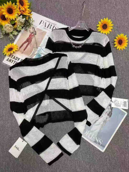 早秋新款靓妹短款宽松撞色黑白条纹针织长袖小衫,带配饰有垫肩(个别没有配饰),均码面料柔软舒适透气,420件,全清4.9元超低价秒杀!分货加一!
