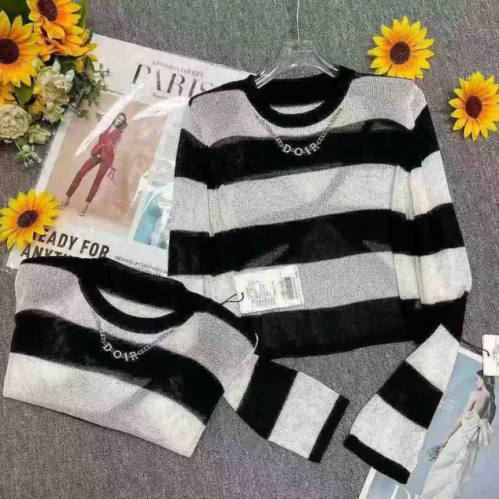 早秋新款靓妹短款宽松撞色黑白条纹针织长袖小衫,带配...
