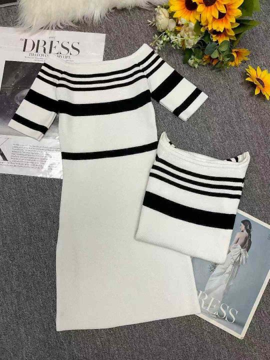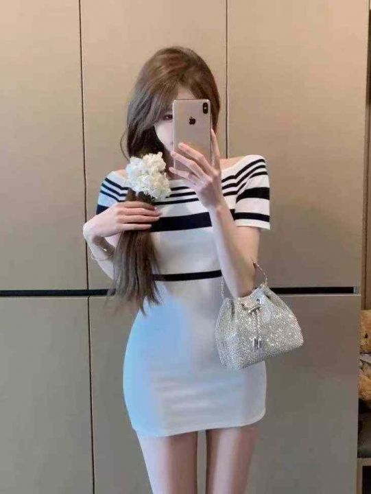 夏季新款韩系撞色条纹一字肩性感纯欲风气质弹力修身显瘦紧身绝美针织连衣裙,独立包装,均码面料柔软舒适透气弹力,100件,全清6.9元超低价秒杀!