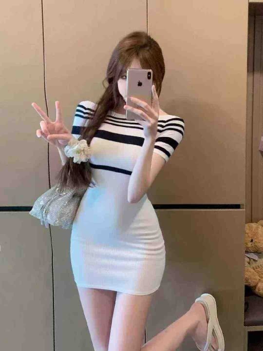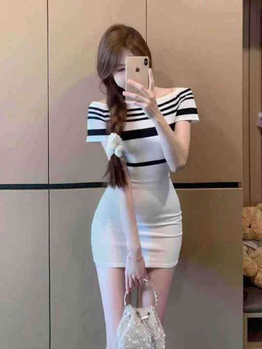 夏季新款韩系撞色条纹一字肩性感纯欲风气质弹力修身显瘦紧身绝美针织连衣裙,独立包装,均码面料柔软舒适透气弹力,100件,全清6.9元超低价秒杀!
