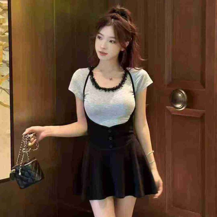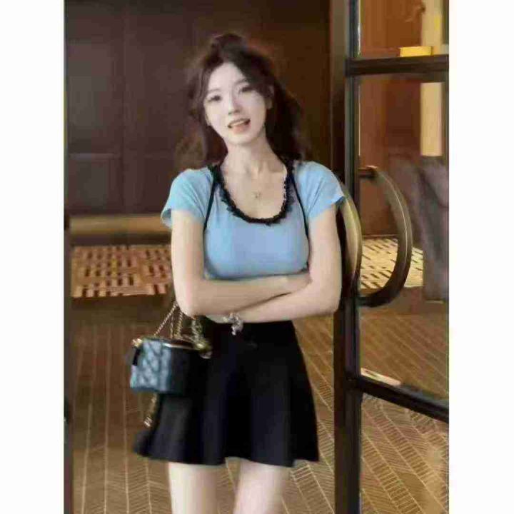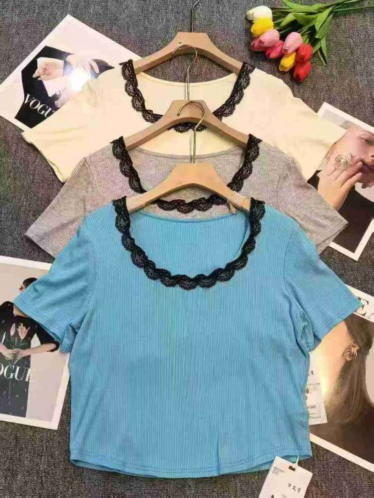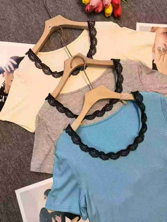 品牌纯欲风U领蕾丝拼接短袖上衣,75件左右,[爱心]蓝色灰色为主,[666]码数3XL穿100斤-150斤,万佳档口新货,[色]原包装️无瑕疵,[勾引]实体店高品质[勾引]