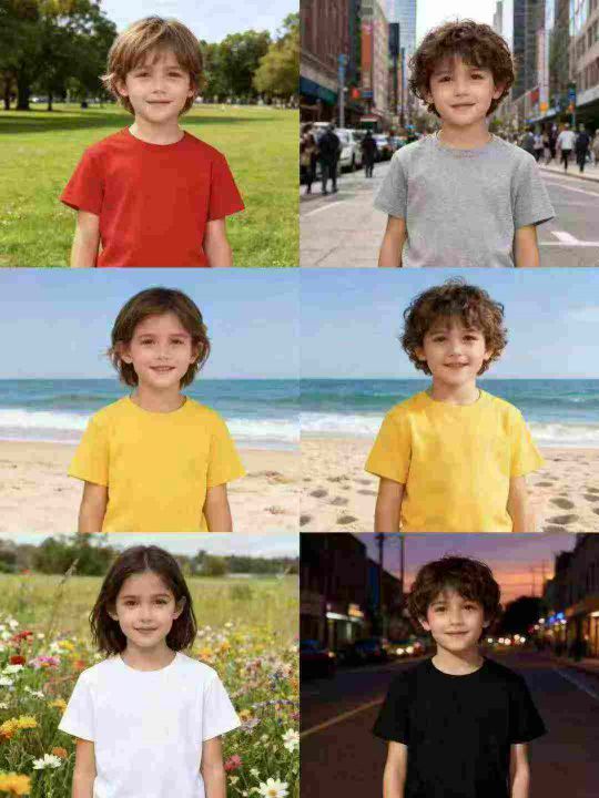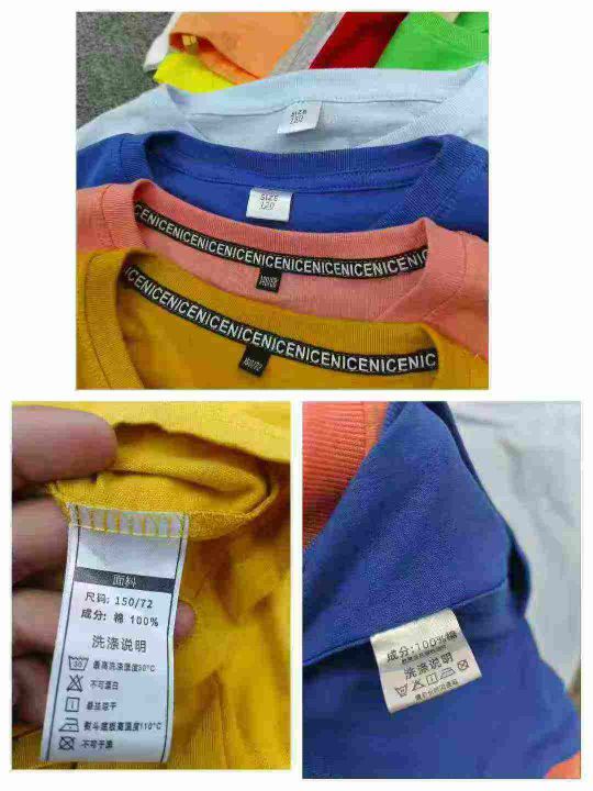 纯棉童装短袖T恤,数量9330件,尺码110--160,有十几个颜色,后领包边到肩,没包边的有111件,十件一包装,有码数清单,大货干净整洁