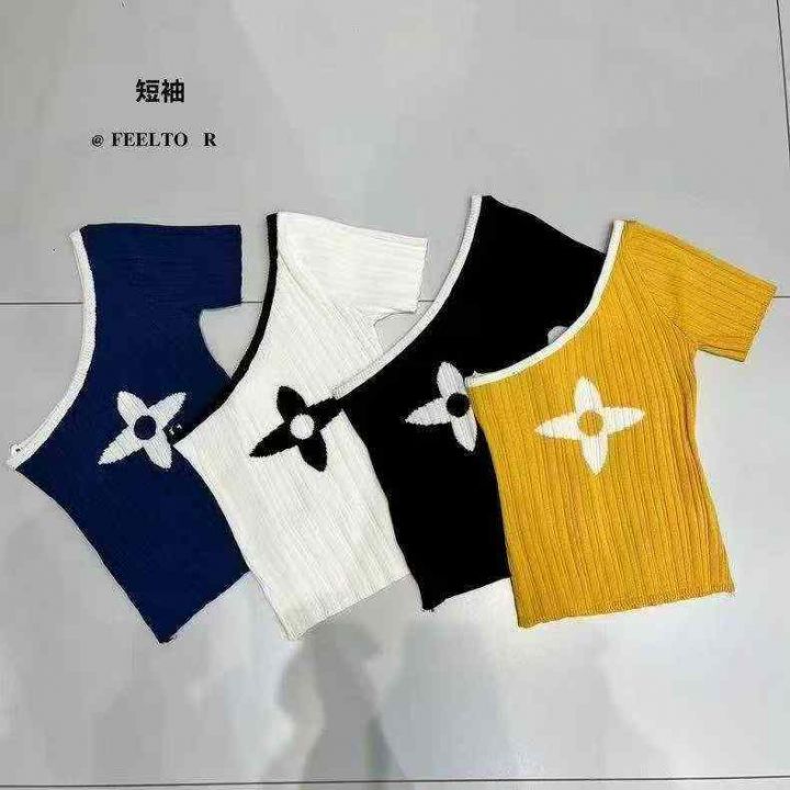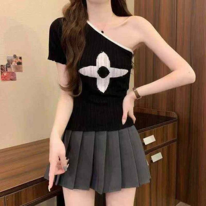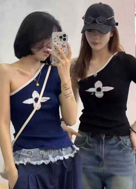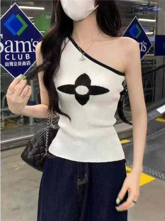 夏季新款高级感性感辣妹纯欲风无袖斜肩撞色针织小衫,...