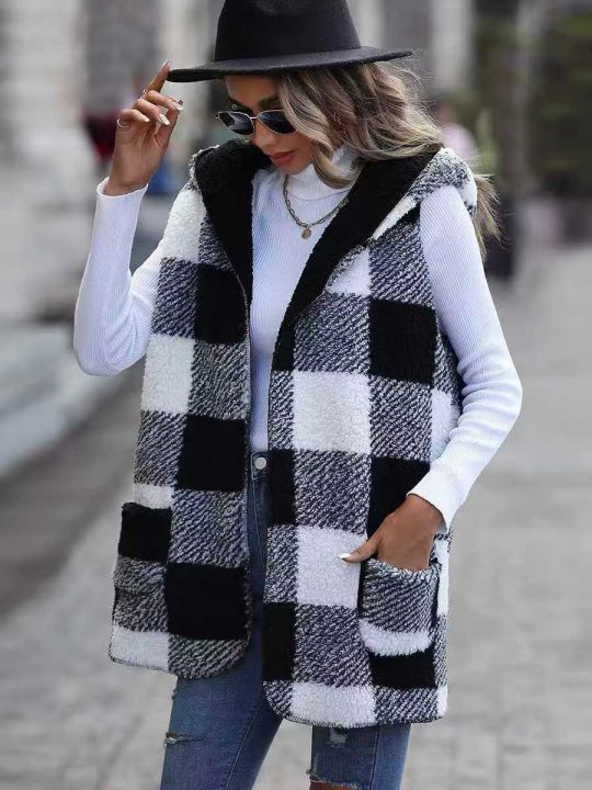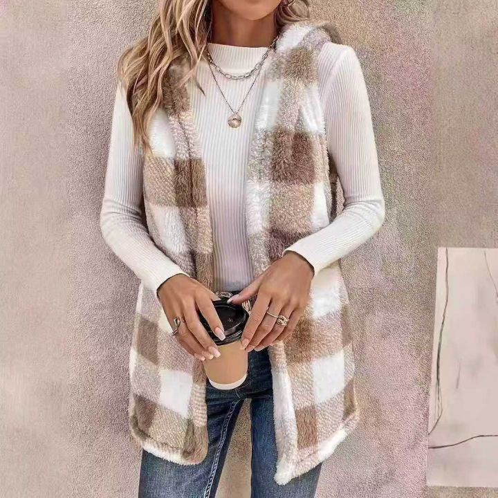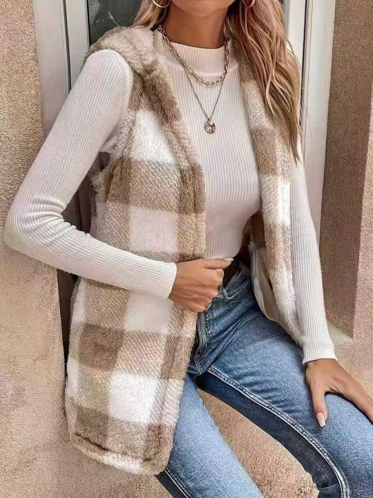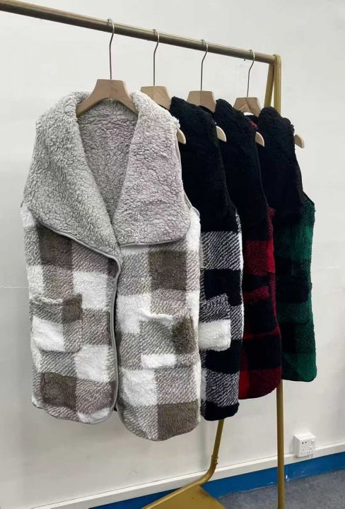 424件大翻领格纹毛绒马甲外套。面料柔软舒适又保暖,...