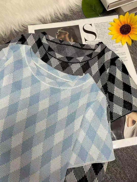 夏季新款冰丝正肩洋气法式别致短款针织短袖,独立包装...