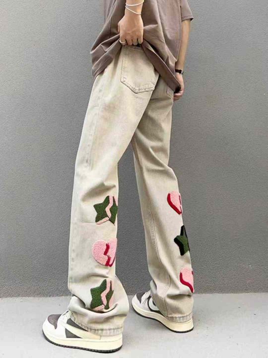 春秋新款国潮美式高街潮牌黄泥染星星植绒刺绣男士小众直筒松紧腰牛仔裤,独...