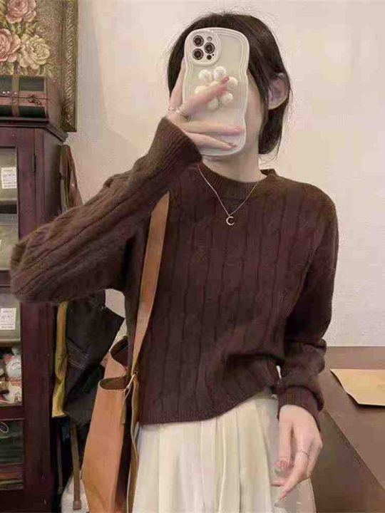 秋冬新款韩版麻花简约慵懒风短款别致包芯纱圆领套头毛...