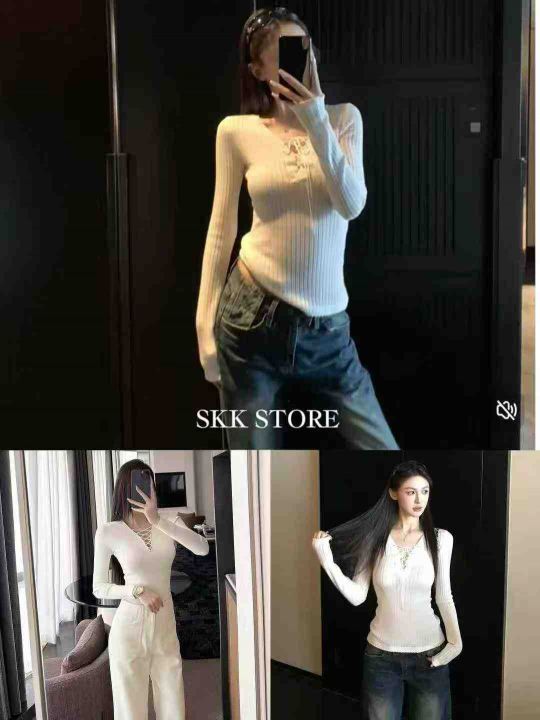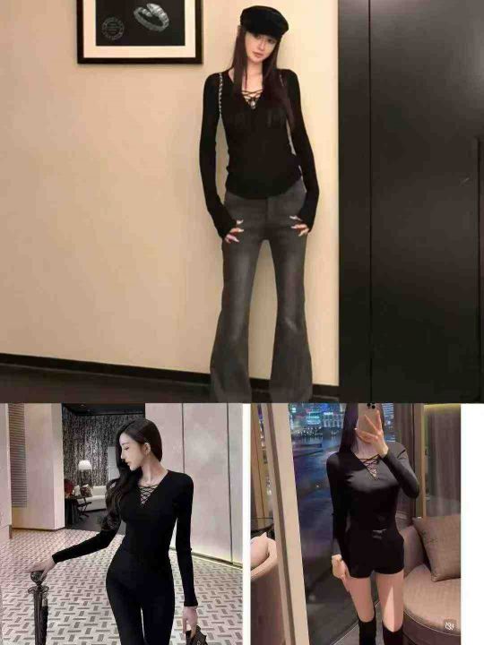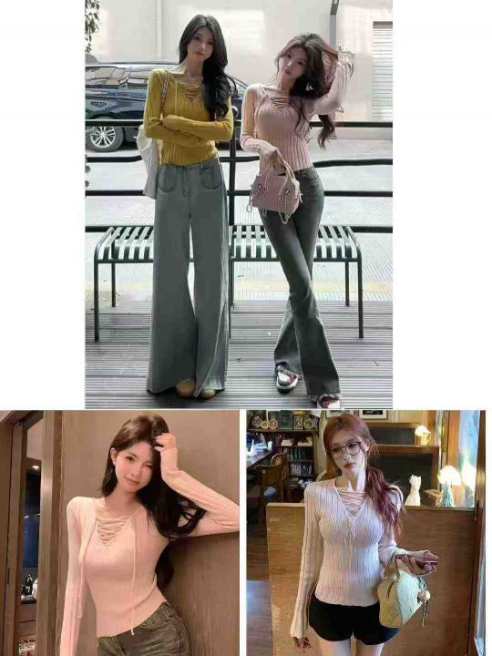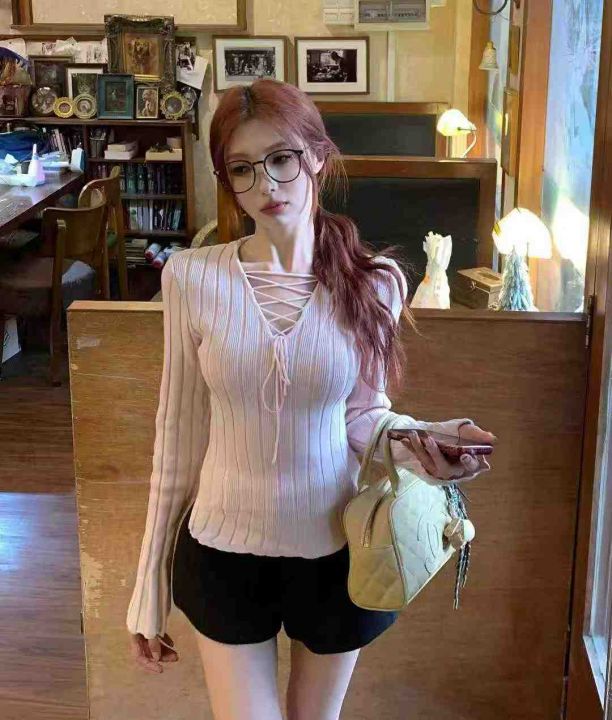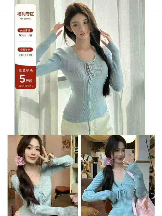 包芯纱V领交叉系带纯欲辣妹针织衫打底外穿上衣,独立...