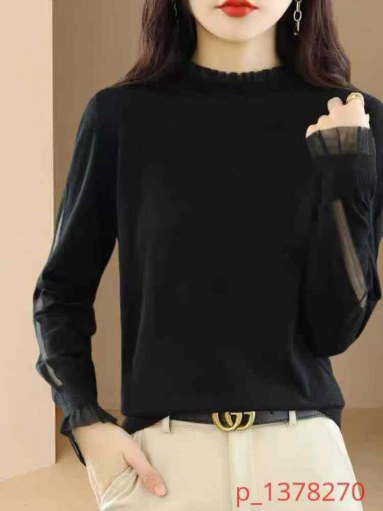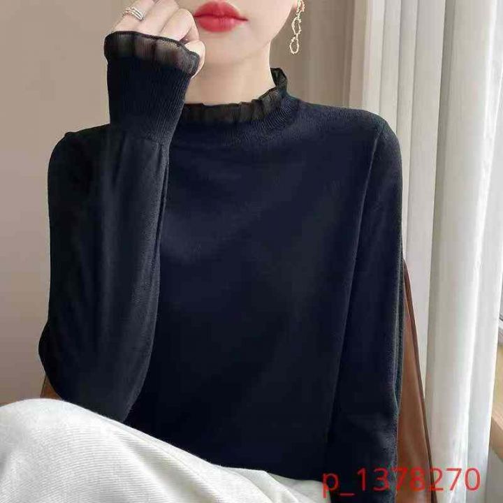 包芯纱气质花边针织衫长袖木耳领打底衫简约百搭上衣,...