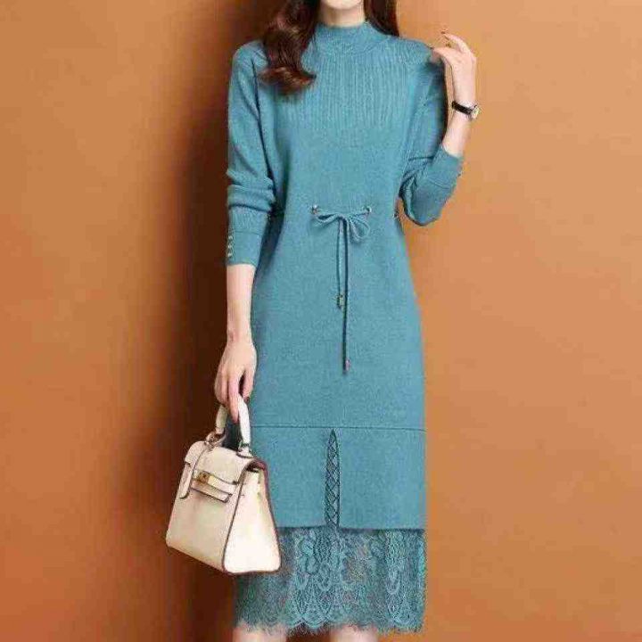 捡漏款秋冬新款高级感收腰显瘦法式蕾丝拼接毛衣连衣裙...