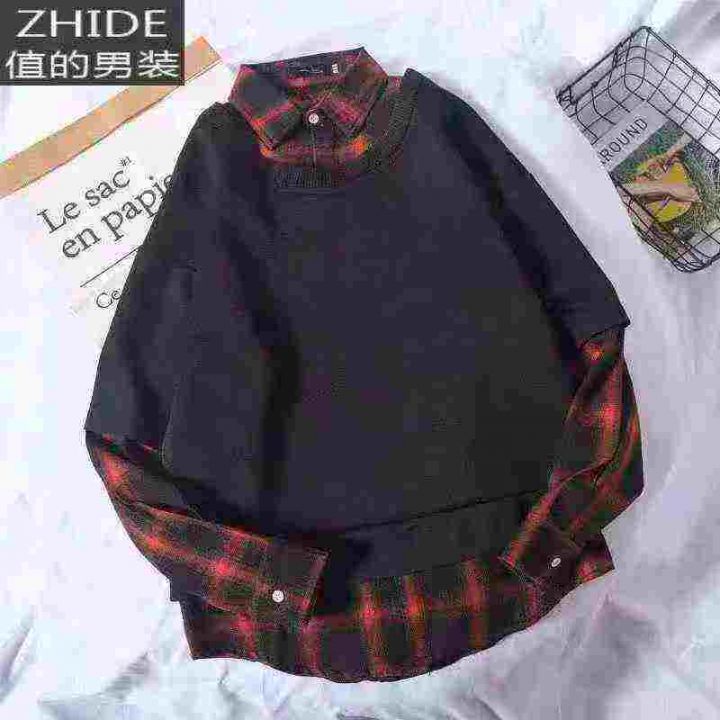爆款假两件卫衣春秋新款美式复古格子上衣宽松休闲,数...