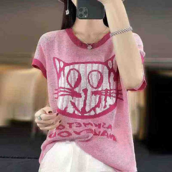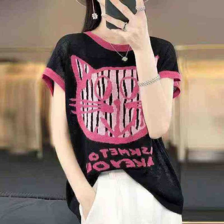 夏季新款时尚设计感拼色猫咪提花宽松慵懒风显瘦落肩针...