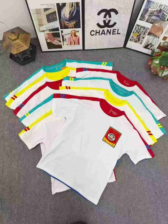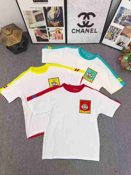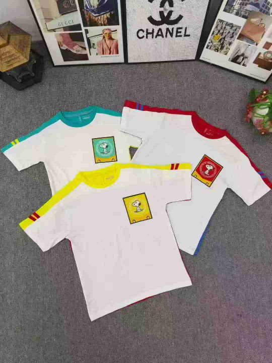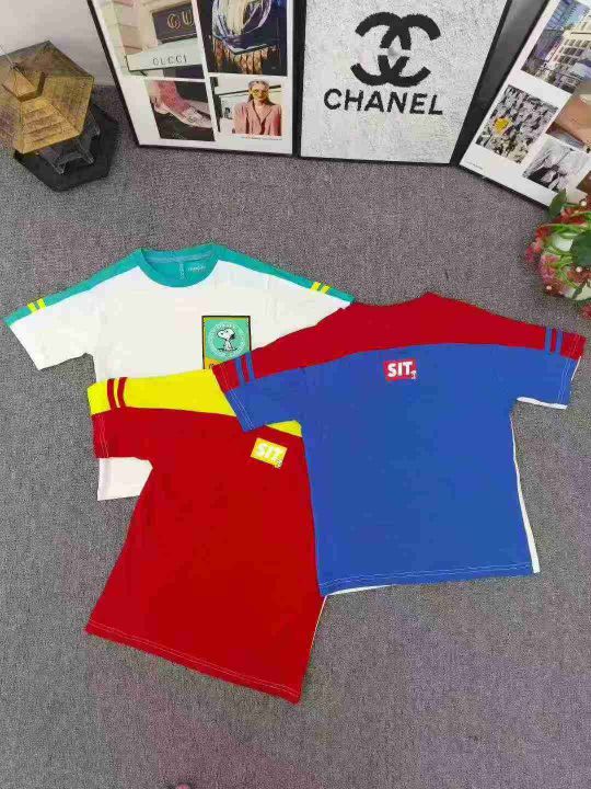 品牌夏季童装拼色T恤 数量2200件左右 尺码110--160 整款三个色 后领包边 面料图7 可分品牌出(史努比、大嘴猴、森马) 独立包装带吊牌 大货干净整齐
