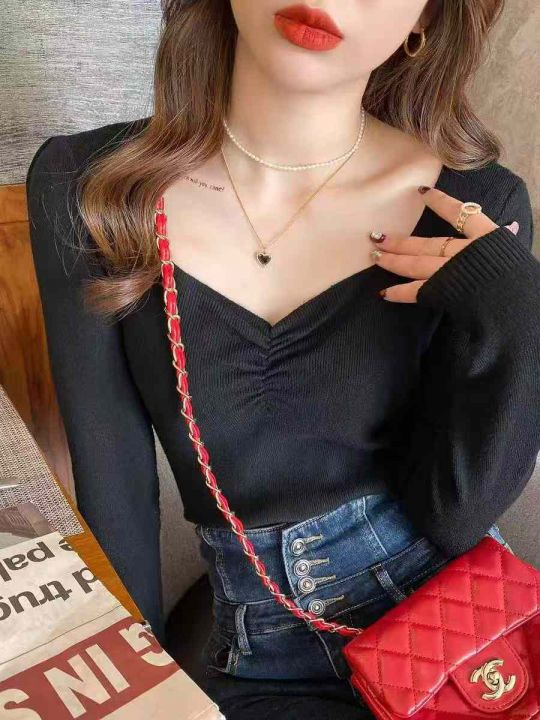 秋季新款弹力修身显瘦V领褶皱套头毛衣,独立包装,单...