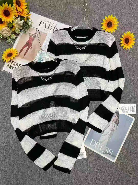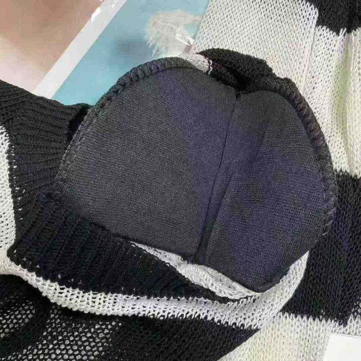 早秋新款靓妹短款宽松撞色黑白条纹针织长袖小衫,带配饰有垫肩(个别没有配饰),均码面料柔软舒适透气,420件,全清4.9元超低价秒杀!分货加一!