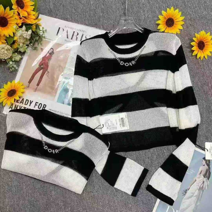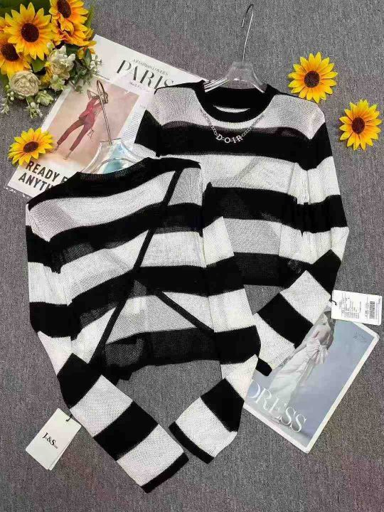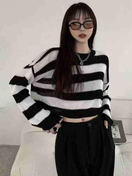 早秋新款靓妹短款宽松撞色黑白条纹针织长袖小衫,带配...
