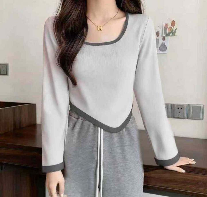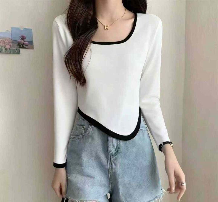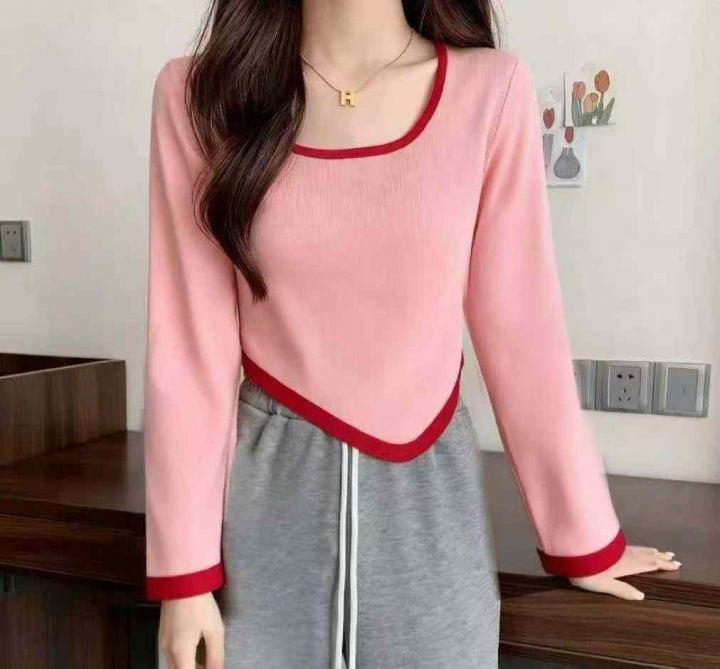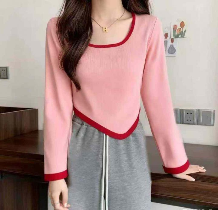 秋冬新款撞色高腰设计不规则纯欲风短款针织套头毛衣,...