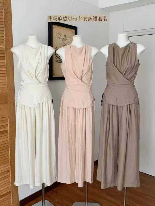 法式套装会呼吸麻感背心绑带上衣女夏松紧腰宽松休闲裤裙套装 315套全清14.8...