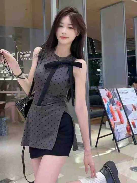 捡漏173件灰色波点时尚辣妹圆领无袖背心纯欲风蝴蝶结开叉不规则上衣,独立包装,码数1-4码,(货号920#68)