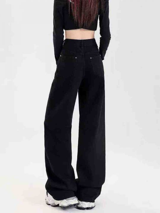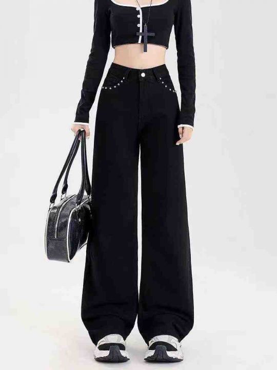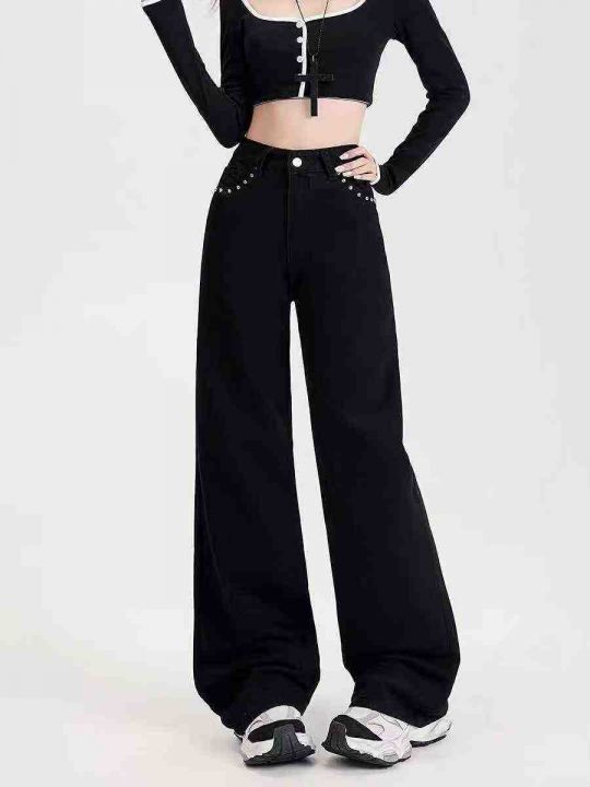 美式铆钉设计款高腰宽松显瘦牛仔裤,单款单色,独立包...