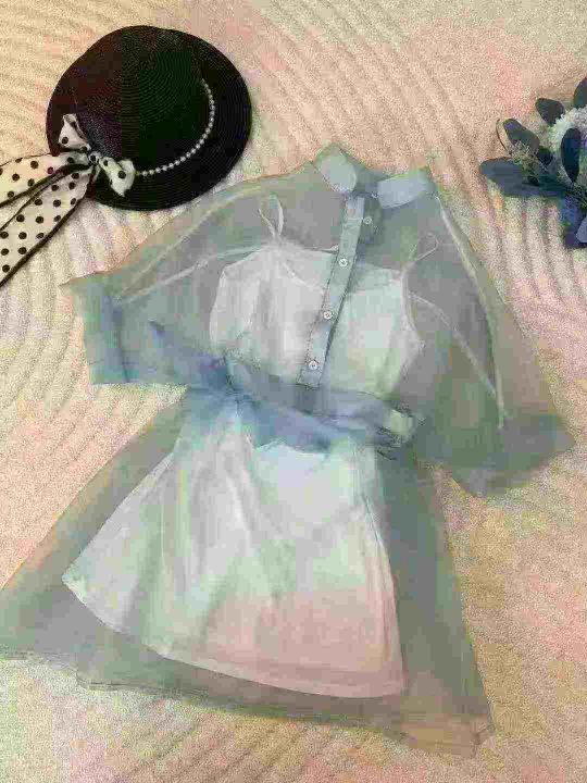 【两件套】镂空薄纱短裙收腰甜美两件套吊带衫欧根纱连衣裙上衣