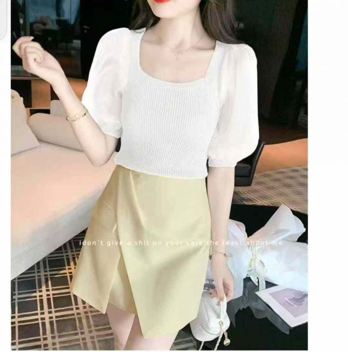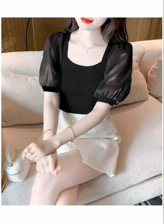 夏季新款时尚法式方领拼接泡泡袖弹力修身针织小衫,独立包装,均码面料柔软舒适弹力大,930件,腾仓库,全清5.9元亏本处理!分货加一!